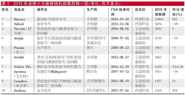 來自IMS Health的數據顯示,2015年全球抗感染類藥物年銷售額達1084億美元,2016年將達1262億美元,2021年將增至1832億美元,該市場復合增長率為7.7%。驅動這一市場增長的主要因素是抗病毒藥物的高速發展,基于此,筆者對2015年全球最暢銷的十大抗病毒藥物進行梳理。