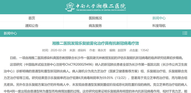 湘雅二醫(yī)院:湘雅二醫(yī)院發(fā)現(xiàn)樂復(fù)能霧化治療具有抗新冠病毒療效